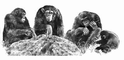 Chimpanzees are known to modify natural objects in order to use them as tools to obtain food. Here they are using stripped grass stems to fish for termites. The insects eaten by chimpanzees provide a source of vitamin B and probably also compensate to some extent for the deficiency of specific amino acids and lipids available in an otherwise largely vegetarian diet. The flesh of animals, which they occasionally kill and eat, also represents an important nutritional supplement in their dietary regime. |